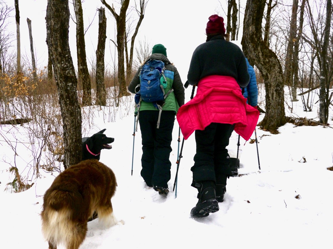 “A dead-end trail, but Lake Champlain views from the Green Mountain region of Lincoln VT are not to be scoffed at. They come few and far between. Now designated a “wilderness”, this area is unmarked, with no easy access. But if you do know your way around, it’s still worth the effort. All told, we need to get out of the house. Frigid temperatures have given way to rain, then ice, then a back & forth, for weeks on end, with just enough snow to justify attempts at skiing. But this trip, reverts to boots, and for me: ice cleats. We leave our trucks pulled off the road into a snow bank, but strategically, not stuck. The dogs are ecstatic. Their enthusiasm alone, will surely propel us up this elevation. We depart from the top of Bristol Notch, heading north but west of Gilmore Hill. I lead us uphill, to a glade that will be full of spring ephemerals, in a few months time. This is where the trail dips & bends, meets a wider track, but darkens. Some passages are to be endured. This basic lesson of the forest, is both anxious, and kind. With a friend, these chapters build camaraderie, and humor. But taken alone, there is little reassurance, until one is through. Soon enough, a voice cries out to alert the group to the tones & accents of a scruffy field, rising beyond the ominous tangle of winter trunks. Not a show piece hayfield or former pasture, the lumber company that sold it may have clear cut it before leaving. There’s not much left but berry bushes, birch saplings, and huge rocks, sitting in odd locations. One path we follow, indicated by the solo track of a lone snow machine, ends at a giant boulder, too steep to climb. However, we’ve caught the lake view, finding other, shorter rocks, to scale. It’s a jaw dropping moment, to see that lake from here. It’s so incongruous. I feel incongruous, frankly, all over. I don’t know what to do, with what I know. I don’t know if what I know, has any relevance, to anyone. Maybe its because I’ve been sick for a month. It’s always hard to get back up to speed. I’m just not sure what speed I’m running at now, or if speed is the exact opposite, of what I really need.”