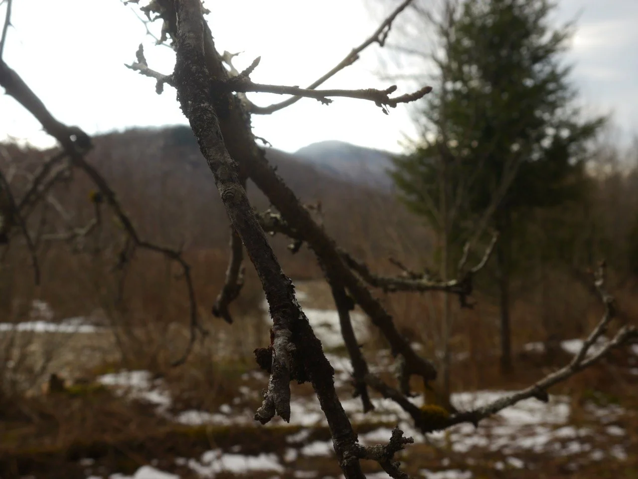 “I’d passed the spot a million times. But this time, I was prepared with the knowledge of where a slim parcel of state land intersected with my roadway. I found the equally slim pull-off, and got my truck onto the shoulder. I guess it being frost heave season, helped me slow down, and contemplate the area with more patience. Not sure, in this case, what “wetlands” would mean or require. I stepped over an old mattress, and made my way down into the flood plain. It wasn’t that bad. Still flattened by recent snows, the walking was easy. I went south first, on the most obvious deer trail. It wasn’t long until I met the river. I don’t know why I’ve always let my mind wander, when it comes to Buel’s Gore. Steep terrain, filled with wild river passages, whichever way you want to look at it. Probably because I had to cross Vermont’s Appalachian Gap so many times, I’ve lost count. And Buel’s Gore, was never the worst of it, but held so many untold stories. I felt that, without the means to understand what I was feeling, yet. My brief winter living in Hanksville, adjacent to Buel’s Gore, might have something to do with it. But here I was today, on my first day, stepping into the Huntington River, at the farthest eastern reach of the Lewis Creek Wildlife Management Area. Go figure. That still makes little sense to me, but I know it would, with a little more research. I traipsed along the waterway, eventually wading into the river, for real, walking the shallows in my muck boots. The water was not dramatic, or overly high, another surprise. I kept walking, looking for a place I could safely cross over, and climb the opposing bank. There would be views of the Gore and the Gap on that side, I was unwilling, to forgo. I took a chance, and made it over. I knew I’d find something. And I did. A broken chair wedged in a tree, a game cam. I keep going. I went a ways up, to a platform, of firs. Many decades ago, not far from here, I’d driven up a very rough track of 4th class road, invited to dinner with a fledgling sugar maker, and his wife, to dine, surely by candlelight because the area could not possibly have supported power, back then. If anyone knows the area, you know who it was. This mountain, it seems, runs back into Starksboro, and likely has a more extensive history on that quadrant. Because these slopes are steeper than any you’d want to try to civilize. And maybe that’s why, over here, it’s the Gore. Hillsboro Mountain isn’t one that’s on hiker’s maps. It’s a rough piece of topography. Can’t deny, it felt good, just entering its lower parts, and gazing up, towards the peak. That same morning, driving the opposite direction around 7 am, on the same road, I’d passed young adults standing out in the brisk, early spring air, waiting for a school bus to arrive. Then I passed, the school bus. Imagine your parents, and family, are deep into sugar making, measuring each day, for what it will bring down the mountain and into the sugarhouse. I hope Vermont is never too homogenized with modern ways, that these traditional harvests become impaired. With the ways things are going, I’m worried, and on a bad day, fatalistic. You don’t know what you’ve got, ‘til it’s gone.”
